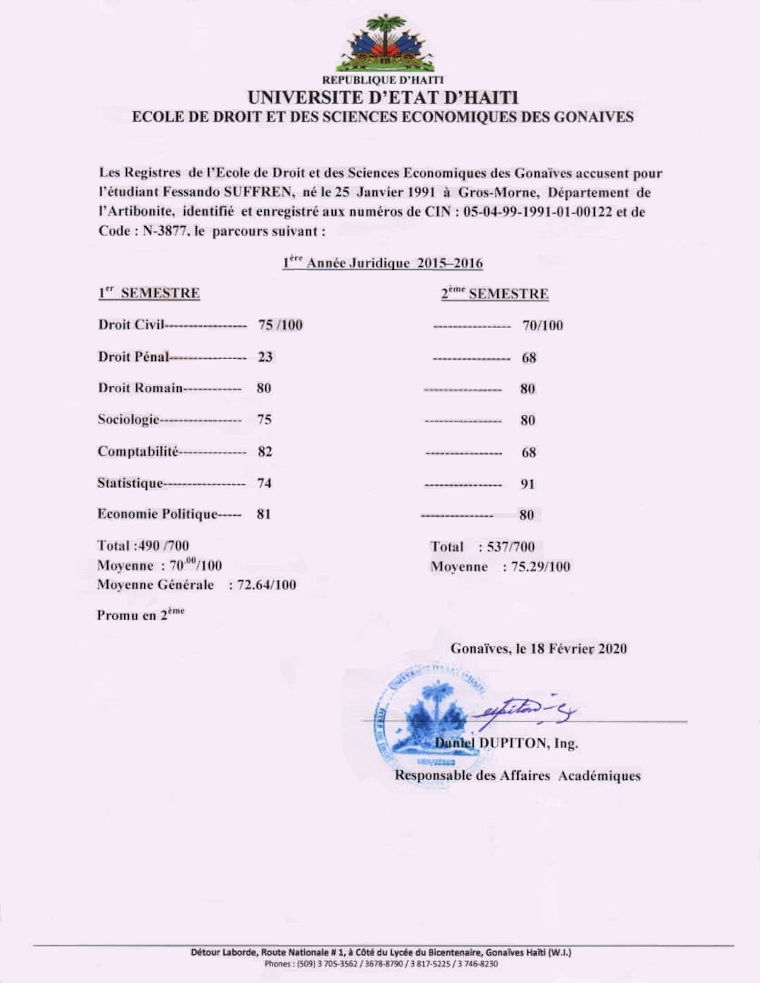 The Registrar of the School of Law and Economic Sciences of Gonaives attests that the student Fessando SUFFREN, born on January 25, 1991 in Gros-Morne, Department of Artibonite, identified and registered with the numbers of CIN: 05-04- 99-1991-01-00122 and Code: N-3877.