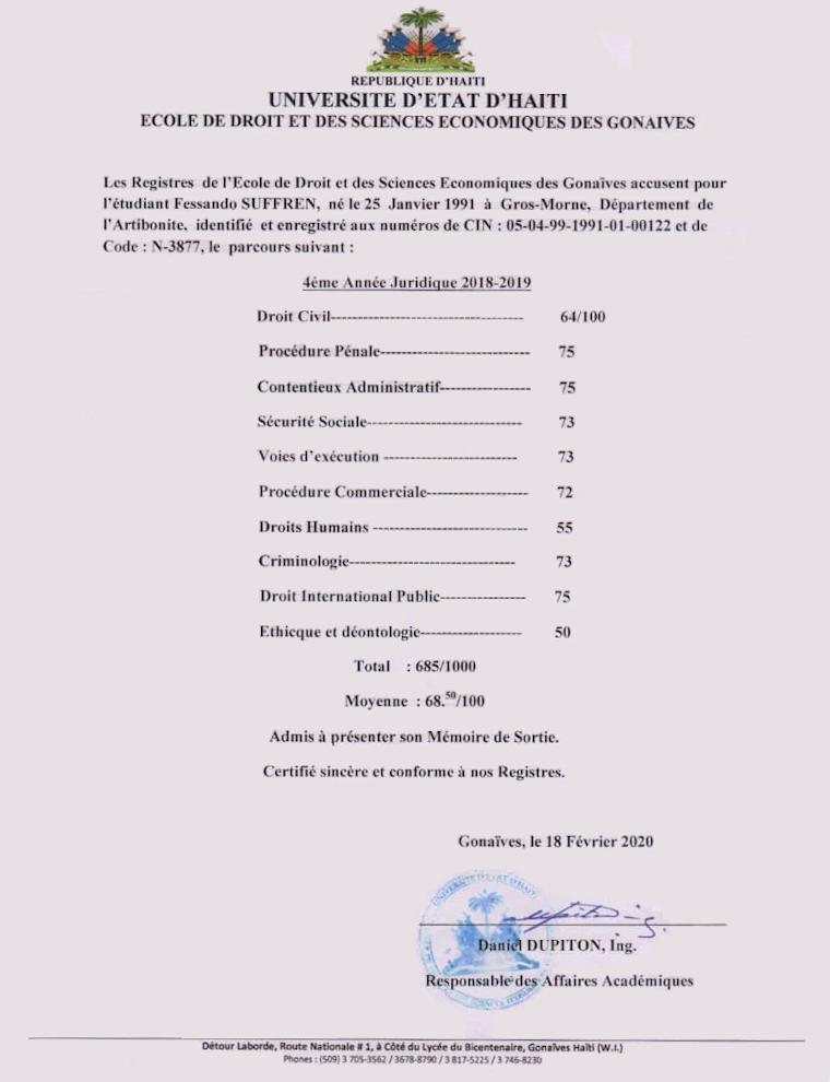 The Registrar of the School of Law and Economic Sciences of Gonaives attests that the student Fessando SUFFREN, born on January 25, 1991 in Gros-Morne, Department of Artibonite, identified and registered with the numbers of CIN: 05-04- 99-1991-01-00122 and Code: N-3877, the following.