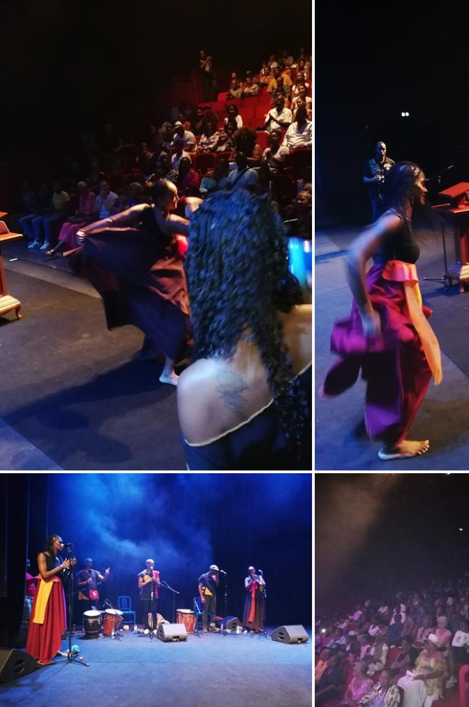 Les auteurs Davis Erauss, Henri Bistoquet, Georges Cocks, Marie Louison, Frantz Durizot, Didyer Mannette, Henri Maurinier, Jean Galleron, et bien d’autres ont su faire voyager l’auditoire, le tenir en haleine et bousculer les consciences. Tout cela s’est déroulé avec un excellent accompagnement musical du groupe Djenm’Mo constitué de cinq artistes talentueux pétris de la tradition du gwoka et s’épanouissant dans plusieurs aspects de cette tradition: chanteurs, danseurs, tanbouyé, chachayè, stylistes, même, pour l’un d’entre eux, pour le plus grand plaisir d’un public ravi qui ne s’en rassasiait pas.