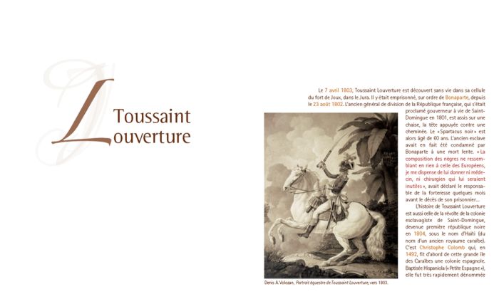 Louverture ToussaintLe 7 avril 1803, Toussaint Louverture est découvert sans vie dans sa cellule du fort de Joux, dans le Jura. Il y était emprisonné, sur ordre de Bonaparte, depuis le 23 août 1802. L’ancien général de division de la République française, qui s’était proclamé gouverneur à vie de Saint-Domingue en 1801, est assis sur une chaise, la tête appuyée contre une cheminée. Le «Spartacus noir» est alors âgé de 60 ans. L’ancien esclave avait en fait été condamné par Bonaparte à une mort lente. «La composition des nègres ne ressemblant en rien à celle des Européens, je me dispense de lui donner ni médecin, ni chirurgien qui lui seraient inutiles», avait déclaré le responsable de la forteresse quelques mois avant le décès de son prisonnier… L’histoire de Toussaint Louverture est aussi celle de la révolte de la colonie esclavagiste de Saint-Domingue, devenue première république noire en 1804, sous le nom d’Haïti (du nom d’un ancien royaume caraïbe). C’est Christophe Colomb qui, en 1492, fit d’abord de cette grande île des Caraïbes une colonie espagnole. Baptisée Hispaniola («Petite Espagne»), elle fut très rapidement dénommée. |