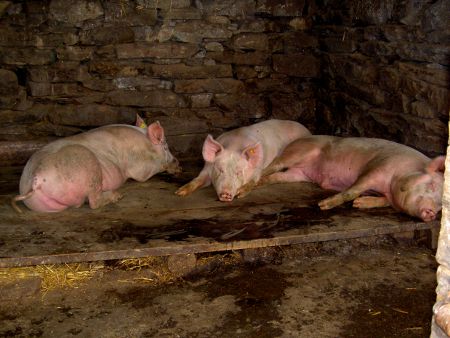 Agoulougwanfal prit la parole. «Parce qu’il nous aime et qu’il a plein de nourriture à nous donner» il ajouta en ricanant. «C’est aussi simple que cela». «Moi, je mange, je mange, je mange, je mange et j’adore cela». «Manger, il n’y a que cela de bon, pour nous les cochons». «Nous sommes utiles. Nous débarrassons les humains des restes. Comme cela, pas de gaspillage». |