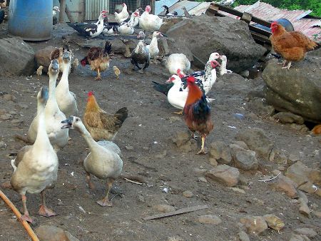 Le chahut qu’Igor et ses amis avaient causé alerta les poules et les coqs qui grattaient le sol légèrement humide. Les canards avaient quitté la mare où ils nageaient paisiblement. Martha avait exigé d’être en tête du cortège et qu’aucun autre canard ne devait la dépasser. Ils arrivèrent tous en courant et passèrent la tête à travers les trous de la barrière en fil de fer. Ils faisaient tous du bruit. Les bêlements des cabris, le grognement des cochons accompagnés des caquètements des poules ainsi que les canards qui jouaient des castagnettes avec leur bec transformèrent l’habitation en un énorme concert sans chef orchestre. |