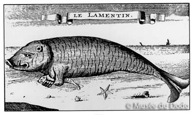 Dugong dugong d'après François Leguat 1708. Autrefois confondus avec le Lamantin. "Le lamantin... se trouve aussi en grande abondance dans les mers de cette île, et paraît par troupes nombreuses... Nous en trouvions quelquefois trois ou quatre cents qui paissaient l'herbe au fond de l'eau et ils étaient si peu effarouchés que souvent nous les tâtions pour choisir le plus gras; nous leur passions une corde à la queue pour les tirer hors de l'eau." - Voyages à Rodrigues de Leguat en 1691, publié en 1708. |