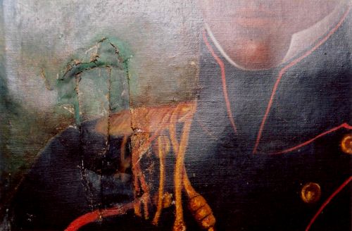 La première fois que nous eûmes la chance de pouvoir admirer ce tableau, c’est un sentiment d’immense tristesse et d’effroi qui s’est soudainement abbattu sur nous, l’impression d’un cauchemar, et cette simple et unique question: comment est-il possible qu’un tableau aussi important, aussi fort en témoignage historique, n’ait pu bénéficier d’aucune protection, ait pu se trouver la proie d’une telle négligence, d’un tel laisser-aller.