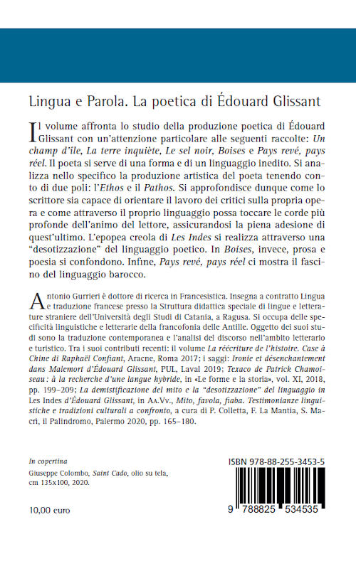 Il bel volume di Antonio Gurrieri percorre alcuni sentieri particolarmente significativi della prima produzione glissantiana: Un champ d’îles, La terre inquiète, Les Indes, Le sel noir. Lo studioso privilegia l’analisi del linguaggio per suggerire, attraverso l’uso di una lingua mai scontata, le tematiche della piantagione e quelle della rivolta; a loro volta, esse perderanno l’«ethos» e il «pathos» nell’immagine seducente della «trame». Conclude il saggio l’analisi puntuale e precisa del linguaggio in Boises e in Pays rêvé, Pays réel.