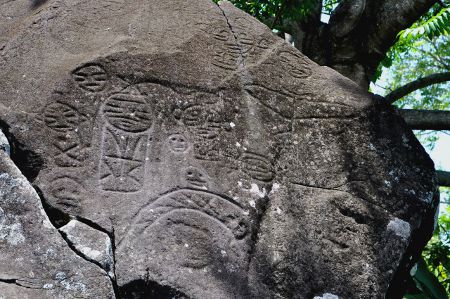 | Il était à présent au beau milieu de la clairière. La dernière fois qu’il était venu à la clairière aux roches marquées, il devait avoir 8 ou 10 ans. Il ne se souvenait plus de l’entrée. Par contre il se souvenait des roches marquées avec deux têtes de boucs gravées sur deux grosses roches et d'autres signes. Il fallait se baisser pour accéder à l’endroit.