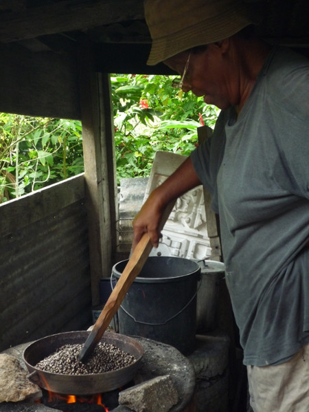 Brice en train de griller les graines de ricin. Photo Geneviève Poullet.