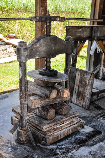 Pressage de la pâte pour extraire l’acide cyanhydrique (poison) et récupérer la fécule.