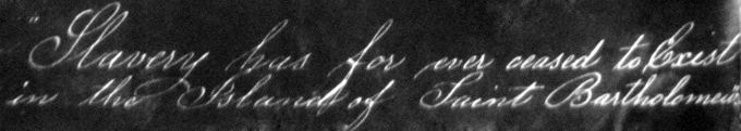 Nous ordonnons et décrétons que tout esclavage ou servitude est et demeure a jamais aboli, et ne pourra plus exister ni être toléré dans cette île Saint Barthélemy et ses dépendances; ce qui sera promulgué pour la rigoureuse obéissance de tous ceux qu’il appartiendra.”