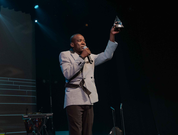 Prestigious Music Awards Live From Julius Littman Performing Arts Theate. André Fouad porte le foulard noir.