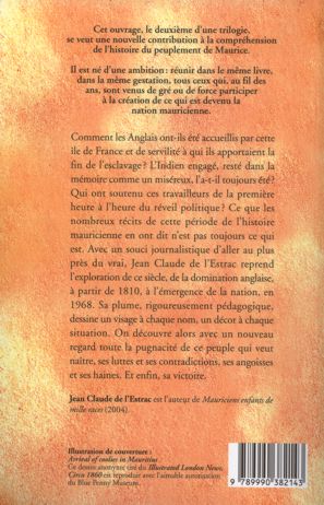 Comment les Anglais ont-ils été accueillis par cette île de France et de servilité à qui ils apportaient la fin de l'esclavage? L'Indien engagé, resté dans la mémoire comme un miséreux, l'a-t-il toujours été? Qui ont soutenu ces travailleurs de la première heure à l'heure du réveil politique? Ce que les nombreux récits de cette période de l'histoire mauricienne en ont dit n'est pas toujours ce qui est. Avec un souci journalistique d'aller au plus près du vrai, Jean Claude de l'Estrac reprend l'exploration de ce siècle, de la domination anglaise, à partir de 1810, à l'émergence de la nation, en 1968. Sa plume, rigoureusement pédagogique, dessine un visage à chaque nom, un décor à chaque situation. On découvre alors avec un nouveau regard toute la pugnacité de ce peuple qui veut naître, ses luttes et ses contradictions, ses angoisses et ses haines. Et enfin, sa victoire.