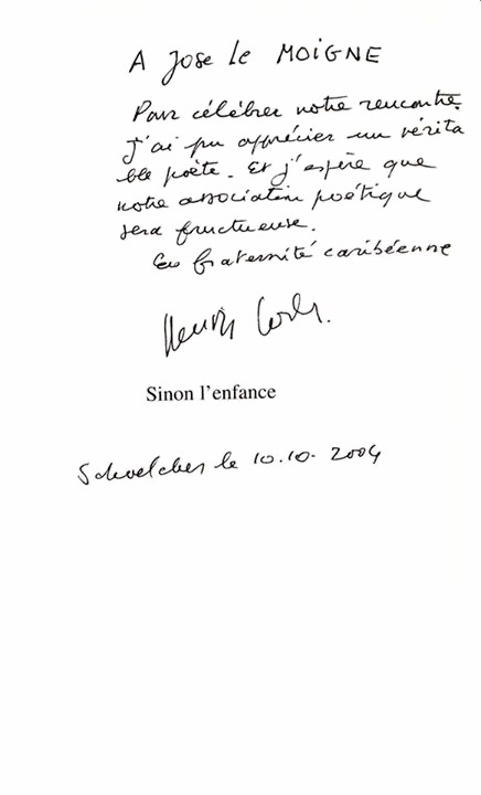 Ce qui reste des poètes c'est leurs poèmes qu'il faut relire, car eux seuls donnent un sens à leur vie et à la notre. J'ai passé beaucoup de temps avec Henri Corbin à Fort-de-France en 2OO4, dans son appartement des Hauts de Terreville à Schœlcher ainsi qu'à la cafétéria du Madiana où nous dégustions des jarrets de porc. Il m'a offert l'essentiel de son œuvre poétique d'où j’extraie pour le partage ce poème.