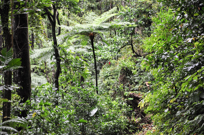 Mais c’est le Macouba qui marquait vraiment la porte entrouverte sur l’inconnu avec cette forêt tropicale très dense qu’il fallait traverser et qui semblait si inhospitalière. Cette route tortueuse qui serpentait difficilement par-dessus ces mornes aux sommets invisibles peinait à enjamber les nombreux cours d’eau qui ravinaient sur tout le trajet. On avait vraiment l’impression de voyager en aveugle sur cette route sentier qui refusait de nous ouvrir d’autre panorama que celui de ces arbres gorgés d’humidité, ces fougères arborescentes et ce bal insolent de tous ces verts déclinant leur nuances sur le fond noir de ces profondeurs malgré la présence d’un soleil ardant; il fallait être bien puissant pour vaincre les rayons de l’astre roi et transformer le décors diurne en une pénombre dont l’audace poussait jusqu’à maîtriser la lumière n’autorisant sa présence qu’à travers de rares espaces dans lesquels elle s’engouffrait péniblement. Nous nous armions alors de courage et d’espérance pour franchir cette muraille végétale et comme pour une longue apnée, nous nous introduisions dans ce tunnel magique en direction de la mer promise.
